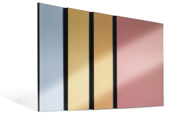 The new coatings are available in the initial standard colours of terracotta, green, blue, yellow, orange, red, bronze, gold, silver and ‘pearl mouse grey’, but can also be supplied in custom colours on request – up to the tape measure size, depending on the white glass substrates used by the module manufacturers.