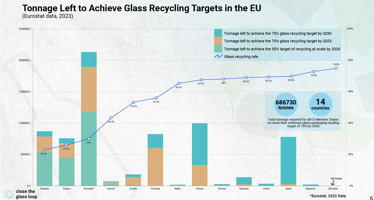 Over 680,000 tonnes of glass packaging are still not being recycled and the gap is concentrated in just 14 EU countries.