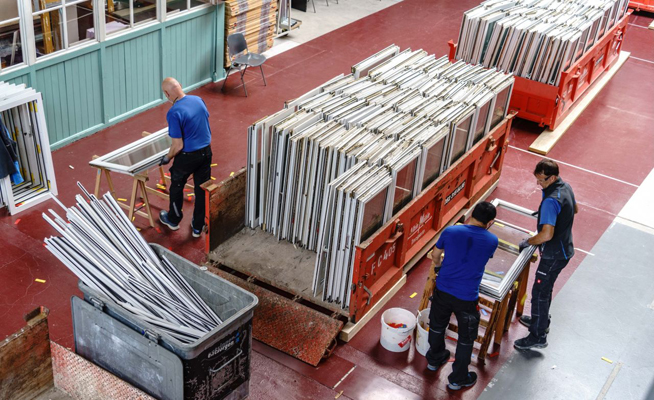 A total of 375 window sashes from a residential building in Winterthur, Switzerland, were dismantled and processed. After separating the insulating glass from the PVC frames and preparing the glass fragments for reuse, more than 2.6 tonnes of recycled glass were reintroduced into the melting furnace of a nearby float glass plant of the Glas Trösch Group. This resulted in CO2 savings of around 1.33 tonnes.