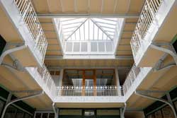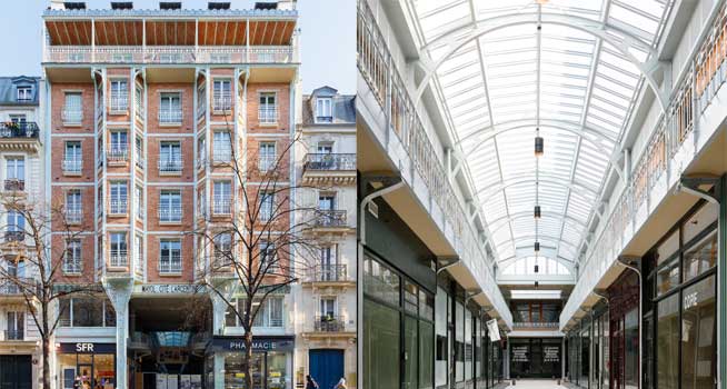 Reminiscent of 19th-century Parisian covered passages, the building houses a shopping arcade on the first two floors, which are overlooked by around thirty apartments. A huge glass roof, supported by a metal structure, covers the arcade.