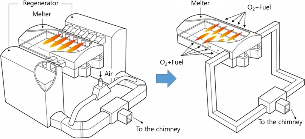 The oxygen combustion method uses high-concentration oxygen instead of air. By introducing this method, combustion without nitrogen becomes possible, improving heat transfer efficiency to the glass. As a result, greenhouse gas (GHG) emissions per melting furnace will be reduced by approximately 20 percent compared to conventional methods, while maintaining the same production volume.